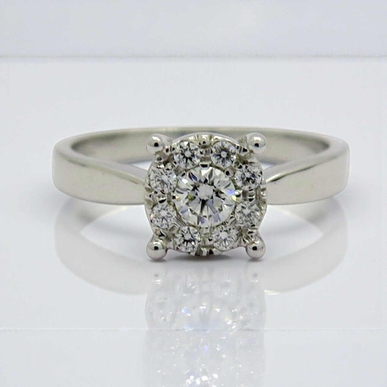 Il diamante centrale pesa 0,18 ct ed è contornato da 8 diamanti dal totale di circa 0,12 ct un