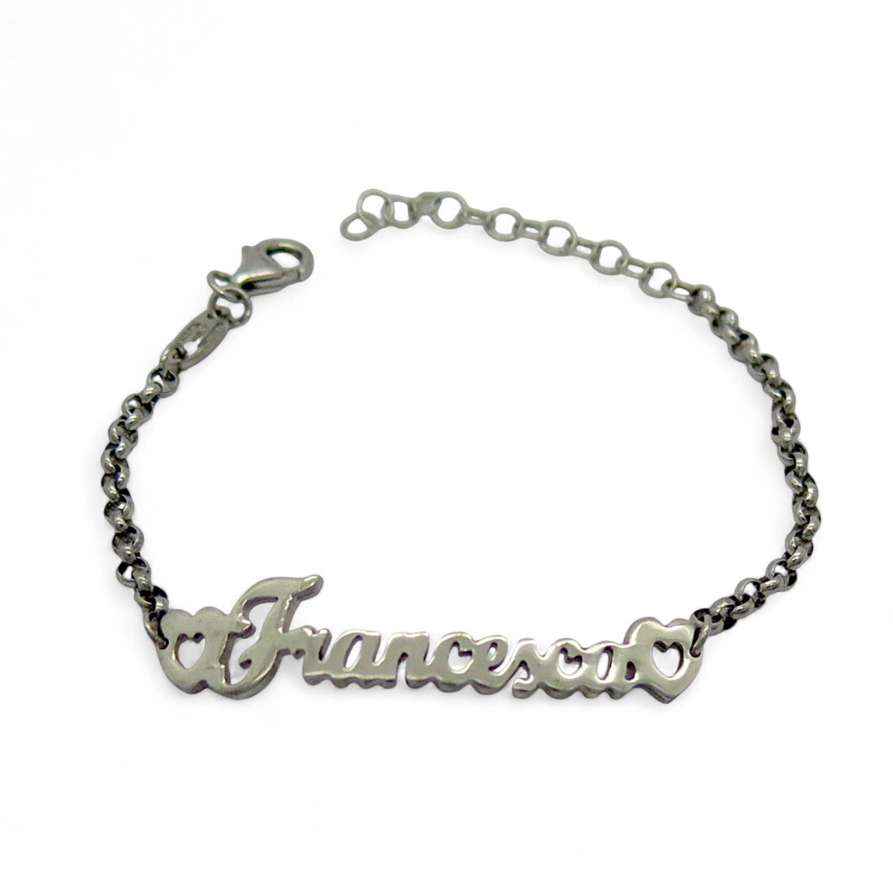 Scopri il Bracciale Francesca cuori argento 925 made in italy, un accessorio unico che unisce stile, qualità e tradizione. Realizzato interamente in Italia, questo bracciale è un simbolo di eleganza senza tempo, perfetto per ogni occasione. Il design unico presenta il nome Francesca è arricchito da due delicati cuori laterali, rendendolo un gioiello personale e sentimentale.