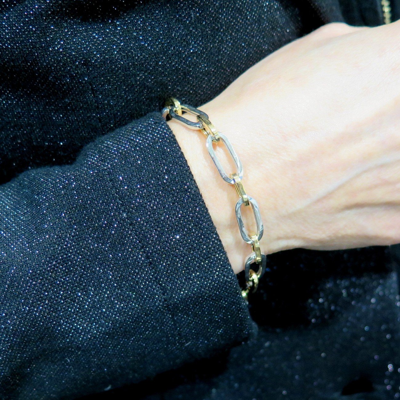 Il bracciale misura 19 cm di lunghezza, ma è stato progettato con un tocco di versatilità unica: può essere facilmente agganciato a una delle maglie precedenti, consentendoti di adattarlo perfettamente alla misura preferita. Con una larghezza di circa 7 mm, le sue maglie ovali attribuiscono una presenza delicata ma degna di nota sul tuo polso, senza mai risultare ingombrante.