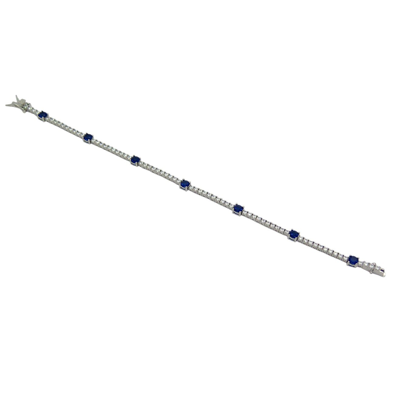 Le pietre bianche del bracciale hanno un diametro di 2 mm, mentre le pietre blu sono più importanti con un diametro di 4 mm, creando un gioco di luce e colore irresistibile. La chiusura a linguetta con doppia sicurezza garantisce stabilità e comfort, assicurando che il gioiello rimanga ben saldo al polso tutto il giorno. Questo meccanismo di chiusura è lo stesso utilizzato nei bracciali di oro e diamanti, conferendo al prodotto un ulteriore livello di esclusività e sicurezza.