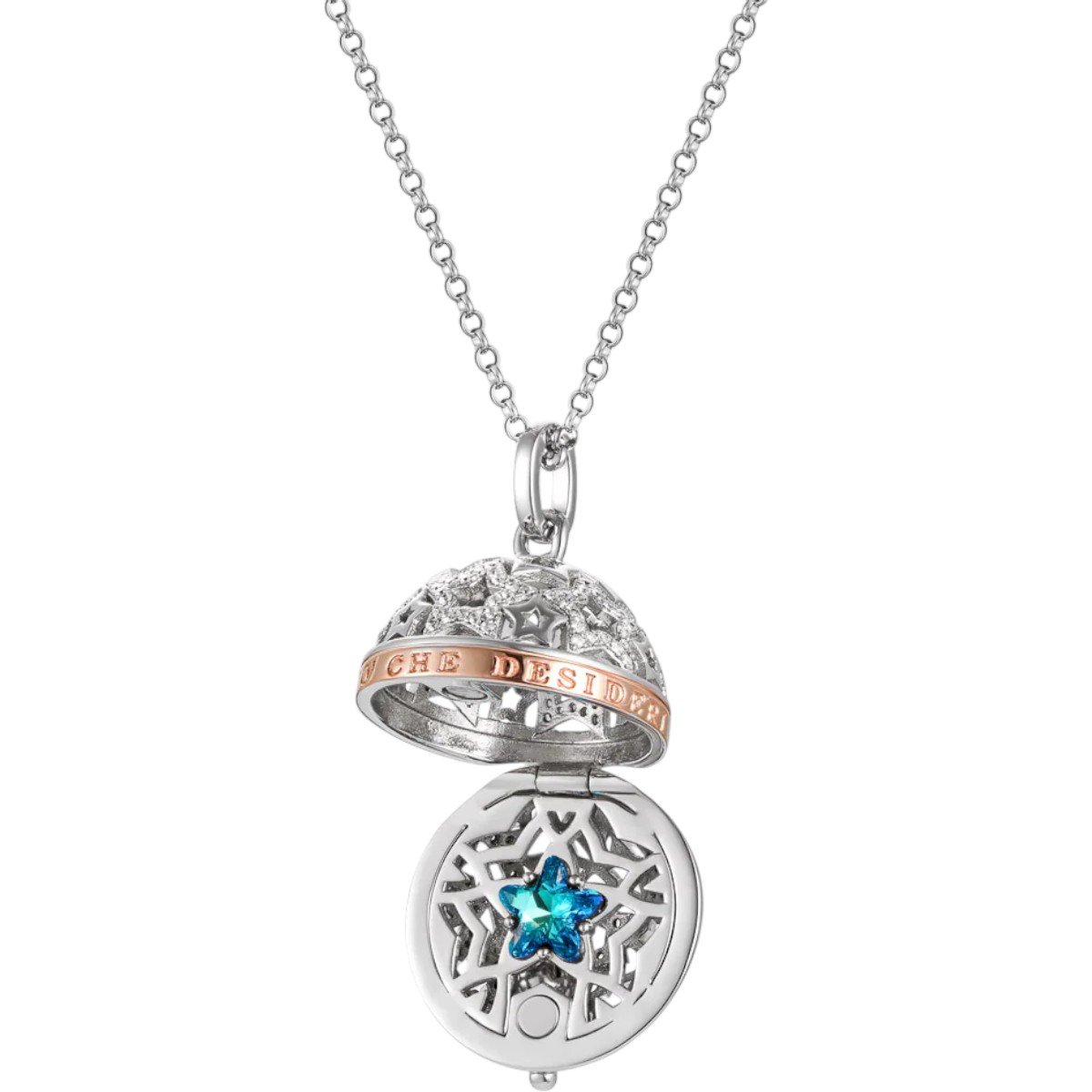 Il Chiama Angeli ” tutto ciò che desideri ” è un meraviglioso pendente che nasconde al proprio interno una luminosa pietra blu, simbolo di amore e protezione. La collana è arricchita anche da una fascia centrale in argento rosato che dona un tocco glamour e moderno ad un gioiello dalla bellezza senza tempo.