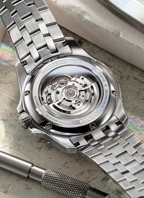 Il movimento automatico Sellita SW200-1 Swiss Made garantisce precisione e affidabilità, dando continuità al lavoro dedicato alla parte estetica. Il rotore personalizzato, scheletrato e trattato al rodio, presenta una finitura Côtes de Genève radiale che ne esalta i dettagli e rende immediatamente riconoscibile il calibro attraverso il fondello in vetro zaffiro.