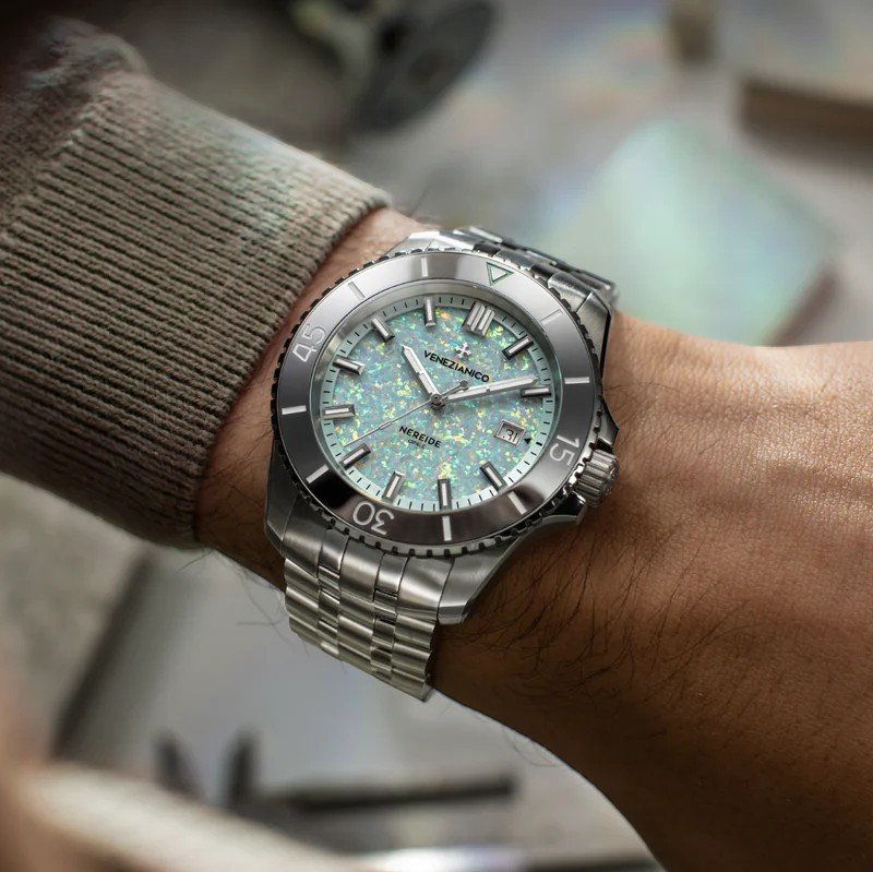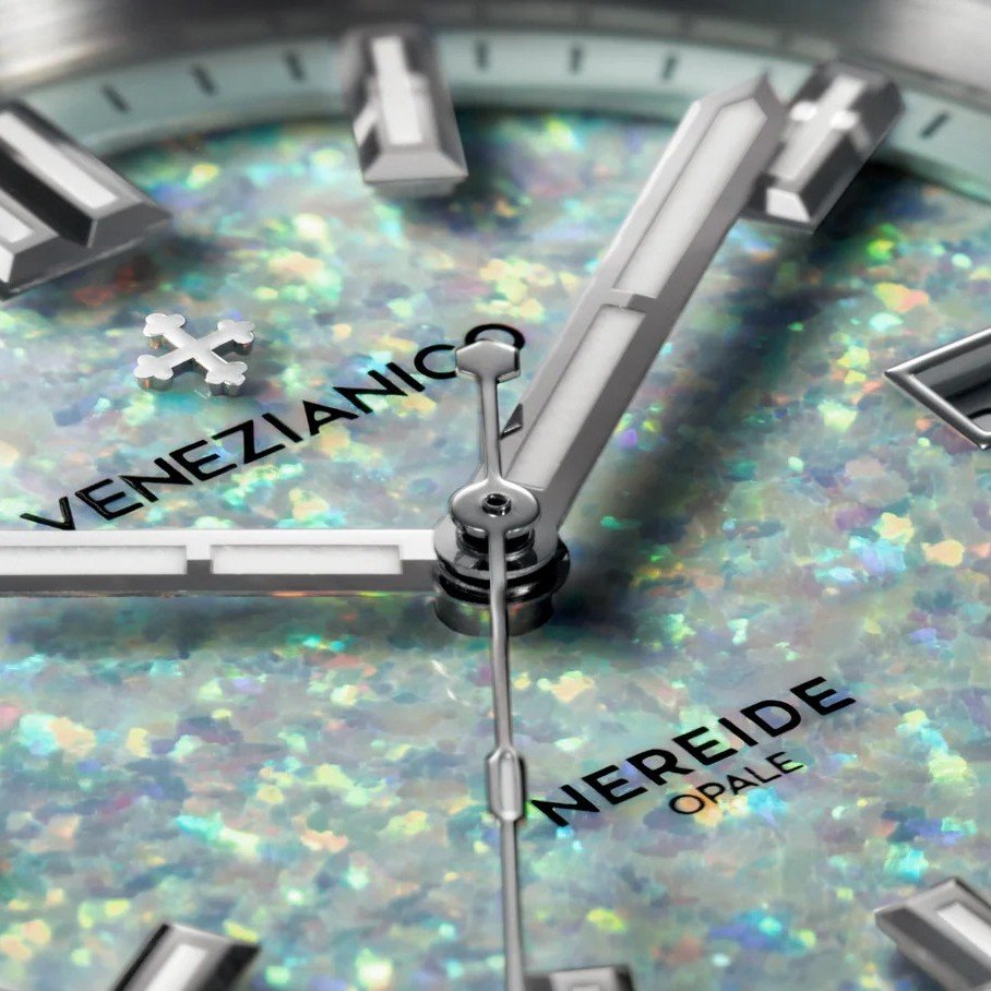 QUADRANTE Opale coltivato in laboratorio con motivo iridescente multicolore, prodotto da Kyocera® in Giappone. Composizione: 80% silice (SiO₂), 20% resina.