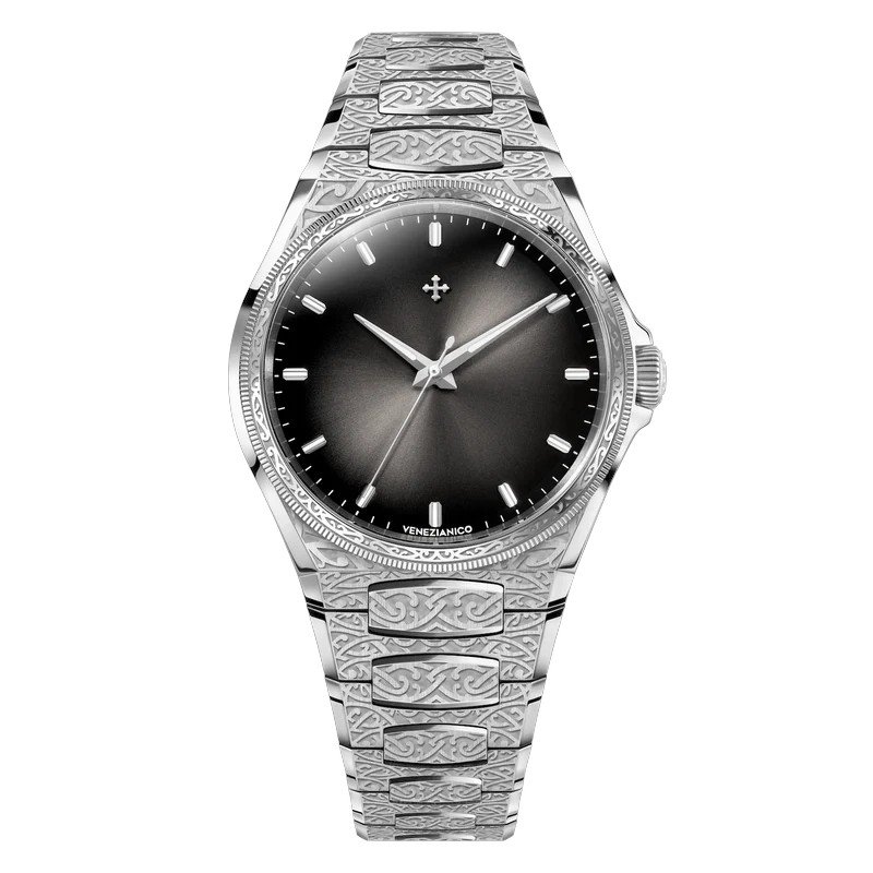 Venezianico Arsenale Bizantino 6221520C nasce dall’incontro tra la ricchezza decorativa dell’arte di Costantinopoli e l’essenzialità del nostro design. Le incisioni, ispirate ai motivi geometrici che un tempo adornavano mosaici e architetture, dialogano con la profondità del quadrante antracite, lavorato con finitura soleil smaltata e sfumatura fumé, creando un contrasto raffinato e armonioso.