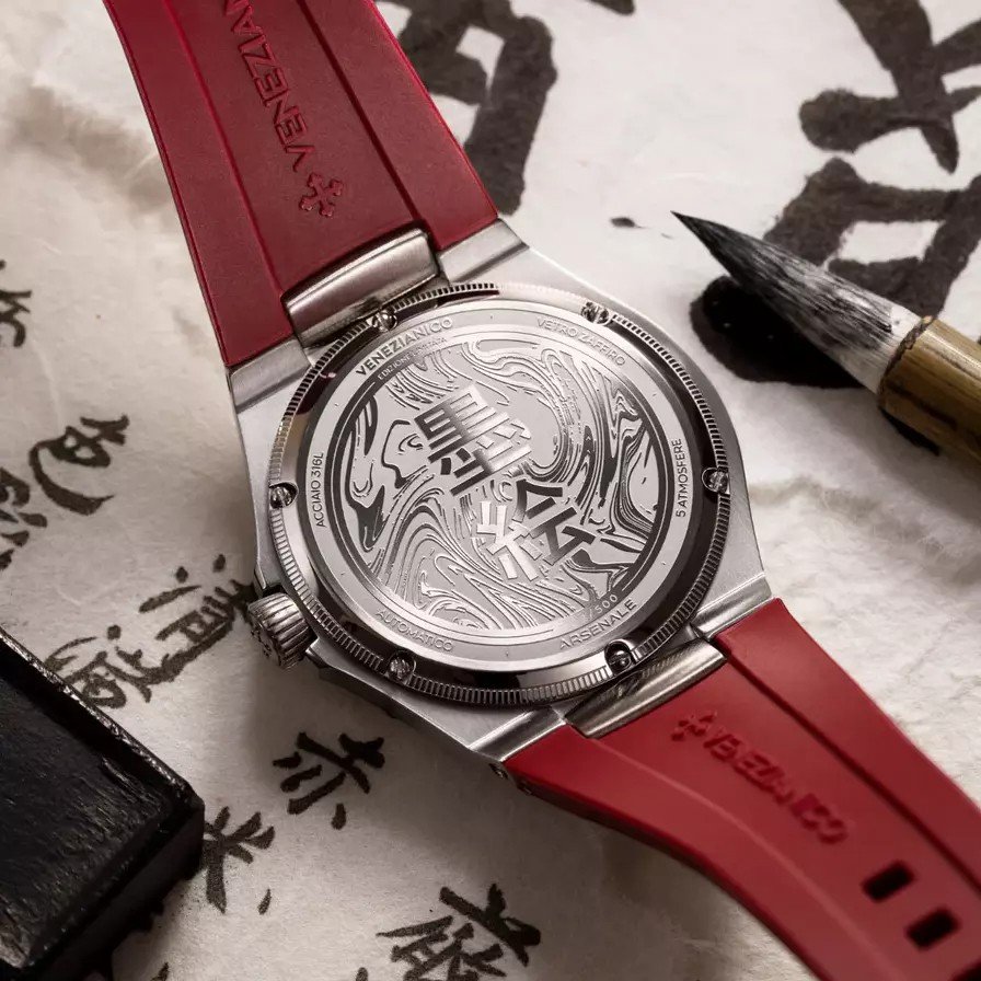 Sul fondello sono incisi i caratteri giapponesi 墨絵 (Sumi-e), che identificano la tecnica pittorica da cui il modello trae ispirazione. Attorno a essi si sviluppa un motivo inciso che evoca l’inchiostro che si dissolve nell’acqua, simbolo di equilibrio e armonia tra gesto e materia. Le linee fluide e la profondità delle incisioni creano un effetto dinamico e vibrante, richiamando il movimento del pennello sul foglio. Nella parte inferiore compare la numerazione progressiva da 1 a 500, a testimoniare l’unicità di ogni esemplare.