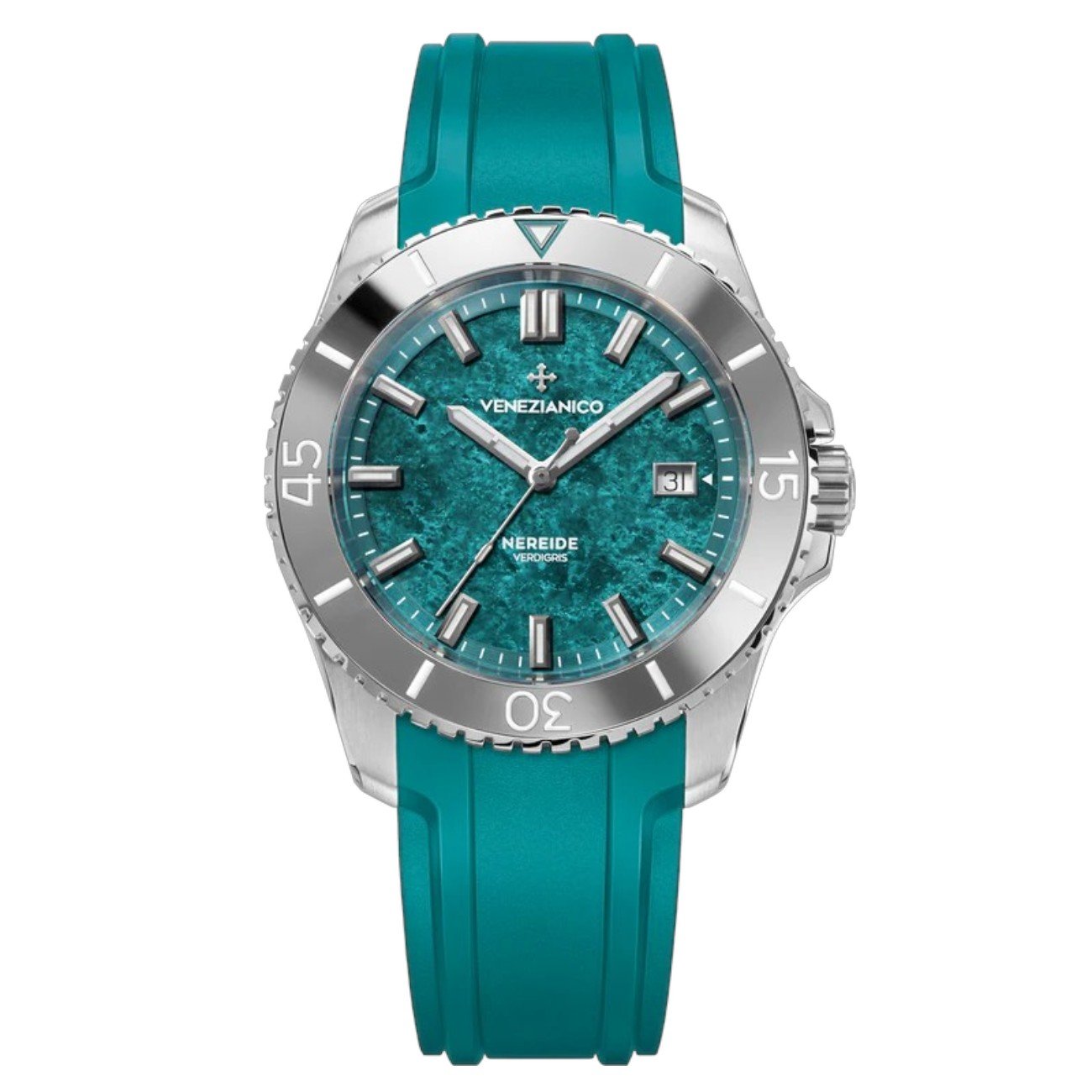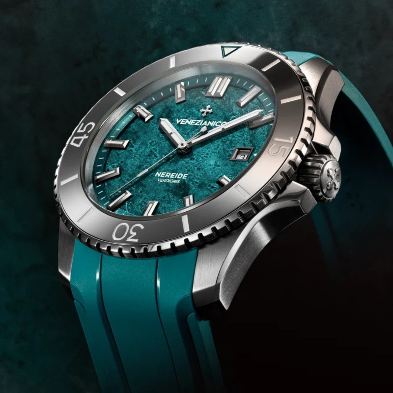 Venezia è una città che cambia nel tempo. L’acqua della laguna, l’aria salmastra e l’umidità trasformano lentamente i metalli delle sue architetture. Su cupole, statue e superfici decorative in rame e ottone si forma una patina verde-turchese chiamata verdigris, tra le tonalità più riconoscibili del paesaggio veneziano. Il quadrante di Nereide Verdigris nasce da questa trasformazione. Realizzato in ottone, è sottoposto a un processo di ossidazione controllata che genera la tipica patina, creando sfumature tra verde, turchese e blu. Ogni quadrante è leggermente diverso e richiama i colori dei metalli veneziani esposti al tempo e alla laguna.